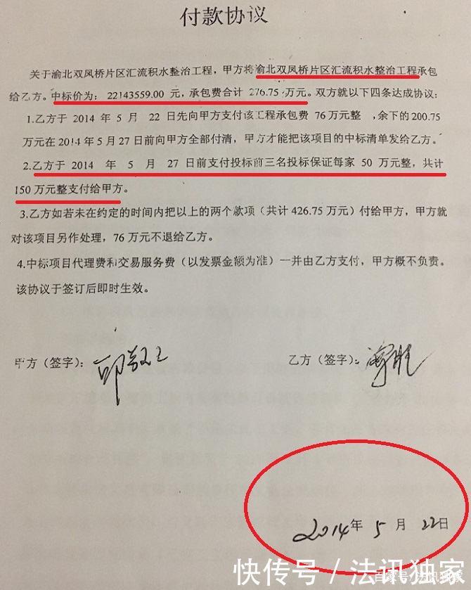 卖标协议书:宏胜市政代表人邱敬元和曾胜签订付款协议。约定将中标价为2214.3599万元的“渝北双汇桥片区汇流积水整治工程”承包给曾胜,曾胜为此花了400多万元获得这个造价2千多万元的工程,约定的买标按14个点子算,也就是276万多元。