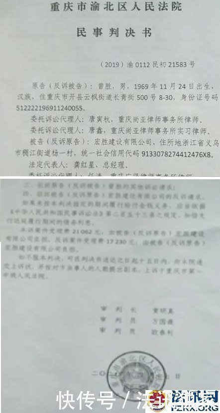 日前,曾胜起诉宏胜建设公司(法人:龚红星 总经理)的建设工程施工合同纠纷一案有了结果:渝北区法院于2019年8月20日受理,2020年4月17日下达民事判决书。