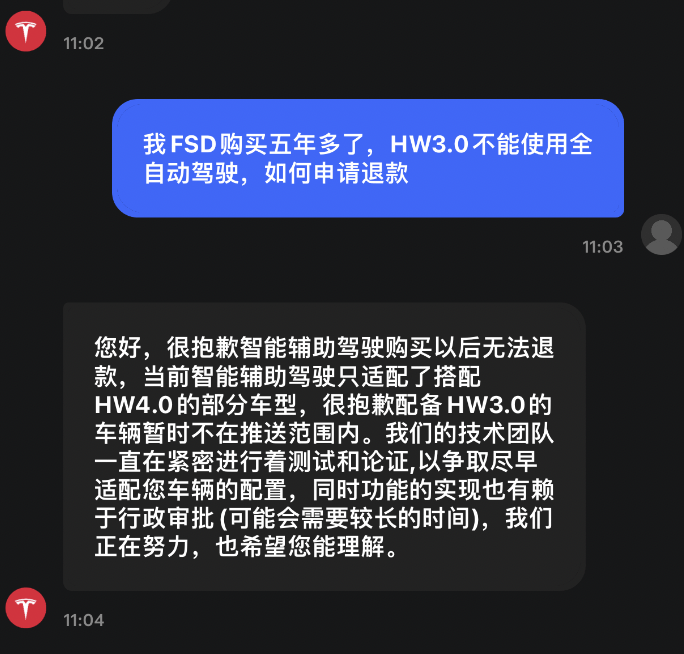 路飞说,购入FSD五年多,仅能够实现高速公路上自动跟车变道,当初宣传的露天停车场自动召唤车辆等功能没有成功实现过,完全自动驾驶更是迟迟没有兑现,“相当于我花5.6万买了一个非常鸡肋的功能。”