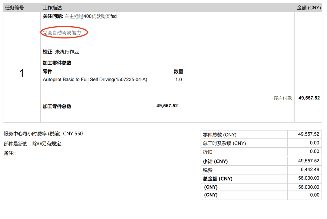 ▲路飞购买特斯拉FSD功能的结算单。受访者供图